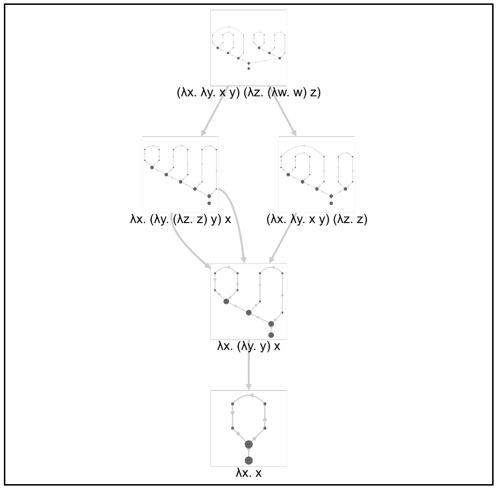All sorts of interesting information is provided about terms, such as the available beta-redexes. By hovering over these redexes, they will be highlighted in the term and on the visualised map. Reductions can be performed by clicking on the redexes, or alternatively the process can be animated in innermost or outermost strategies.